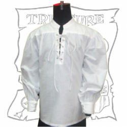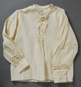 Boy’s Noble’s Shirt — Every good regent knows that it’s all in the details. The attention to detail in this shirt reflects the quality of its wearer. The rows of tiny tucks that run down front and sleeves the laces made from the shirt fabric the reinforced buttonholes on the collar and cuff make this shirt subtly spectacular. It also makes it more period. For a slightly more”Naughty Noble”look it is possible to use the shirt without the lacing because the buttonholes don’t stand out like silver or brass grommets. Our Noble’s Shirts are made from a breezy open-weave cotton that looks very much like linen. These garments are all pre-shrunk and are colorfast. The cotton is much less wrinkle-prone than actual linen and is very soft against the skin.